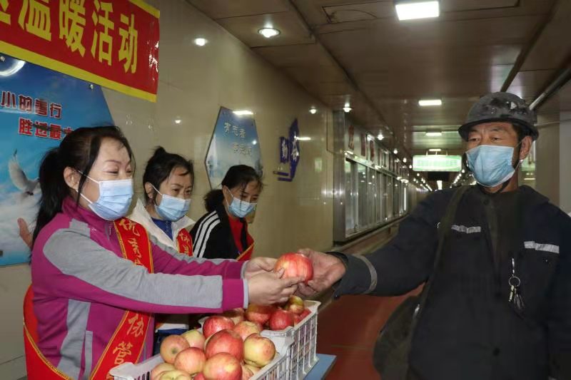 并将又红又大的苹果送到了职工的手中,,,,,,,,看着职工开心的笑脸,,,,,,,,家属们感受着为矿区服务带来的幸福。。。。。
